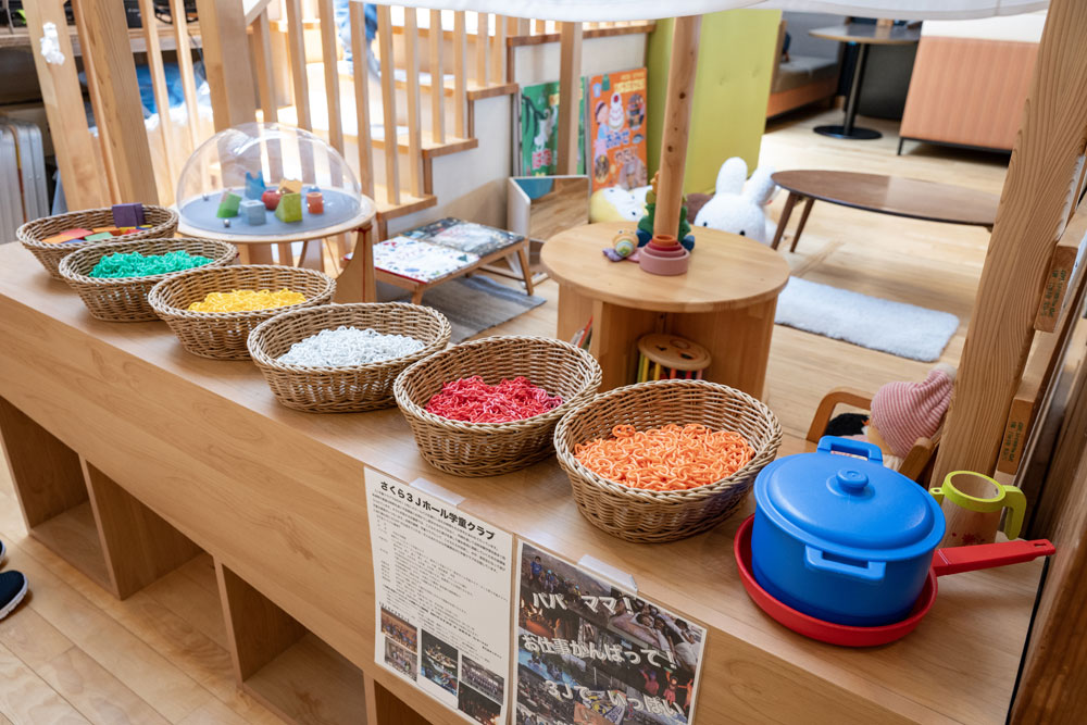 2階には未就園児の子どもとお母さんが自由に遊べてくつろげる「子どもカフェ」も併設。保護者の就労時間などの制限にとらわれず、平日9時〜15時、0歳から未就園の子どもを無料で預けることができ、1階「カフェさくらさく」でのランチも無料で利用できる施設です。地域子ども・子育て支援事業「こども誰でも通園制度」を見据えた取り組みのひとつとしてスタートしました。