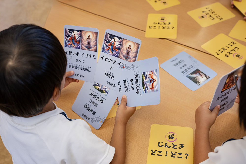 園舎では子どもたちが自分たちで考えた「神社カードゲーム」をして遊んでいました。それを一緒に楽しみながら、つるのさんは言います。