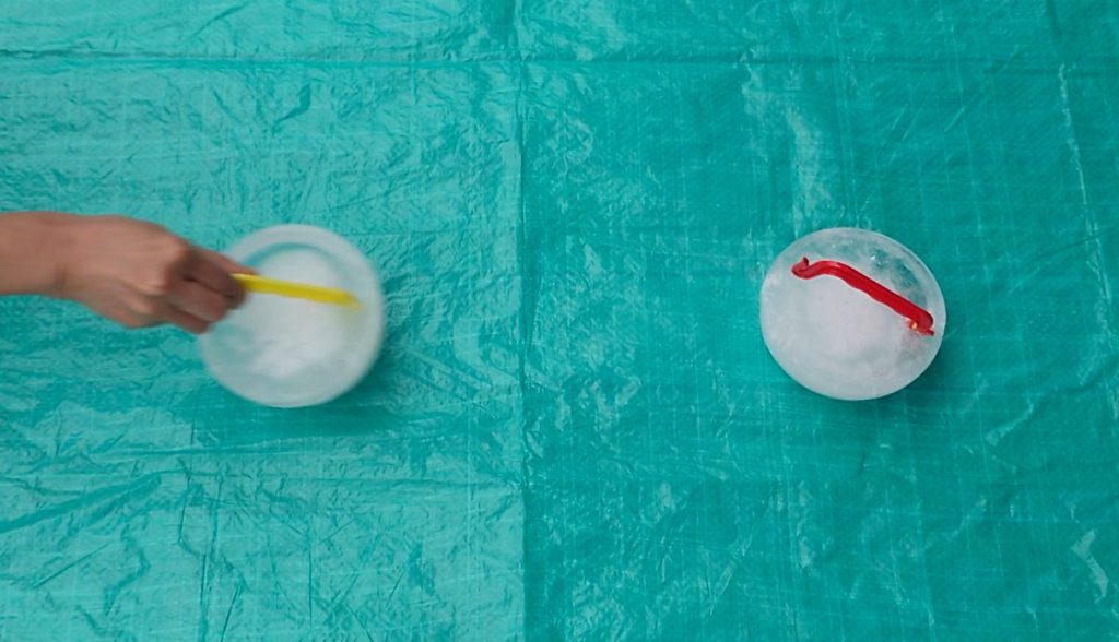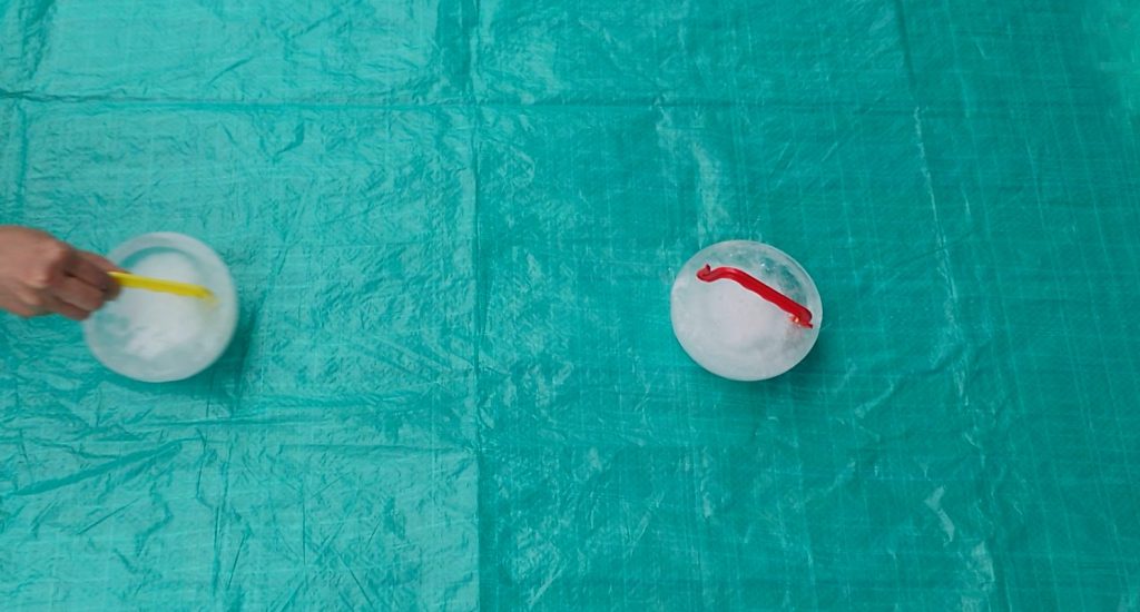 氷が滑りやすいように、平らな床などにシートを敷き、カーリングのように氷を滑らせて遊びます。
