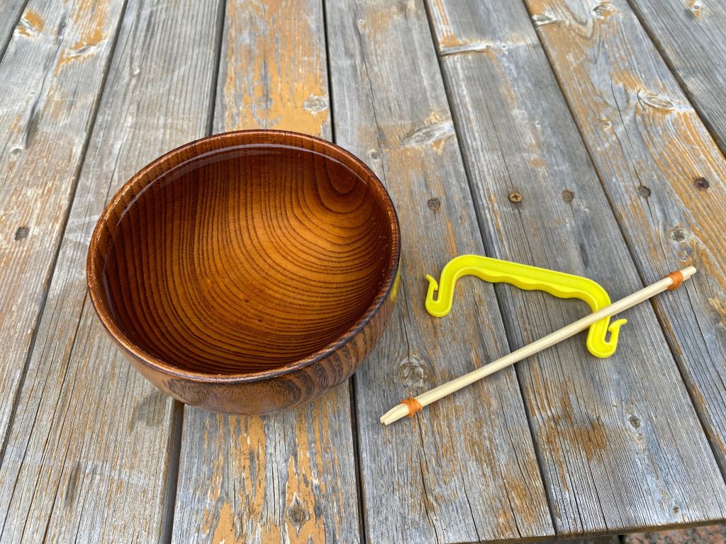 1 どんぶりなどの容器にたっぷりと水を入れる。割り箸を割り、左右に輪ゴムをはめて写真のように持ち手をはさんでおく。