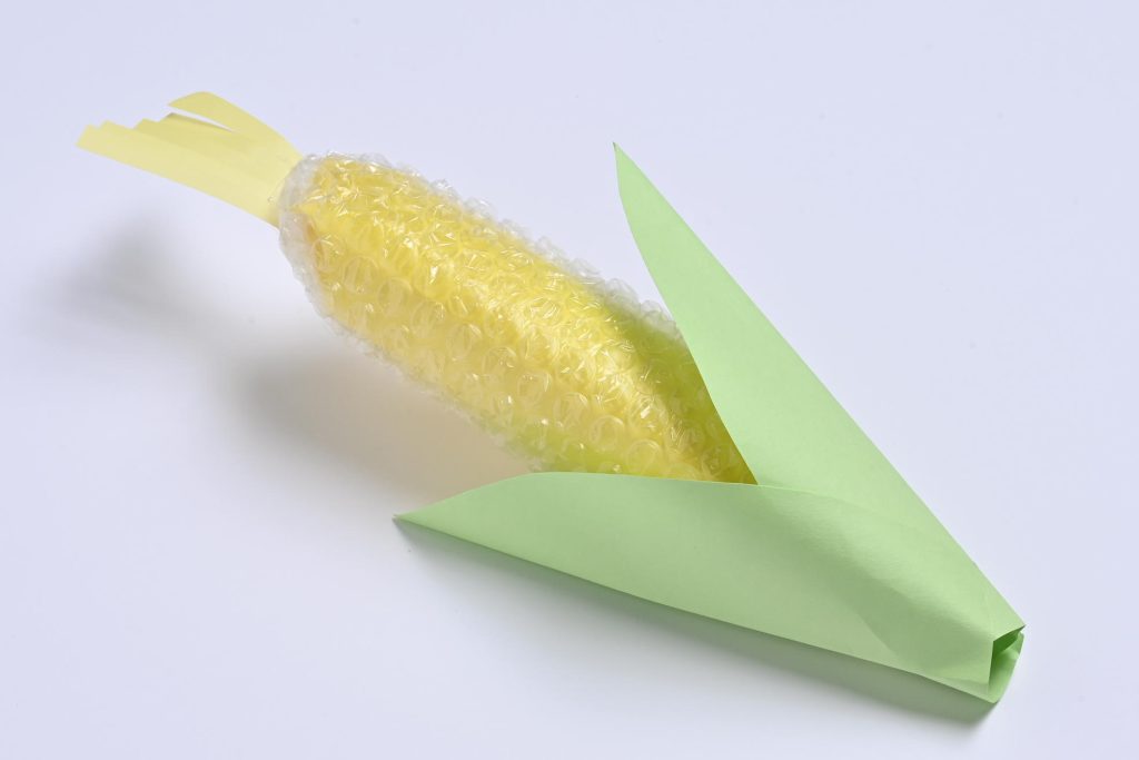 つぶつぶの実がおいしいトウモロコシは、プチプチシート(梱包用シート)でその特徴を表現してみましょう。触り心地もいい感じ!