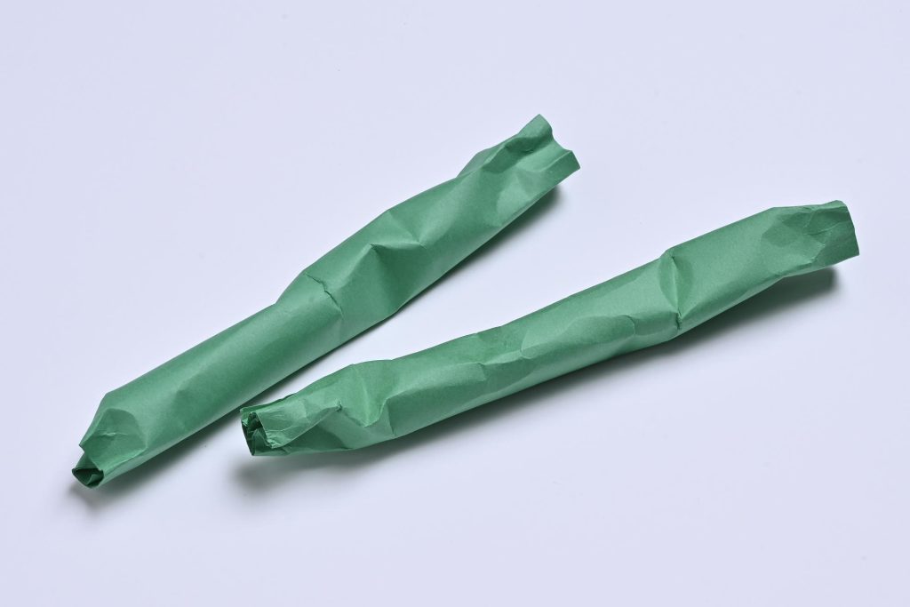 作り方 1 B5サイズぐらいの色画用紙を細くふわっと丸めて棒状にし、上下を軽く絞る。
