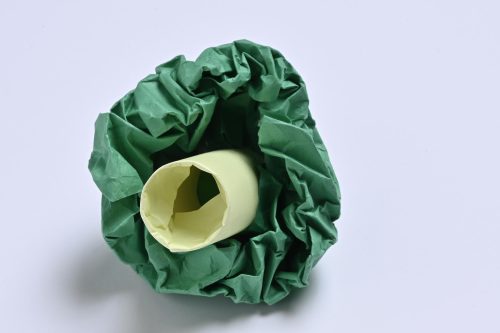 作り方 1 新聞紙を丸めてレタスの形にし、セロハンテープでとめる。