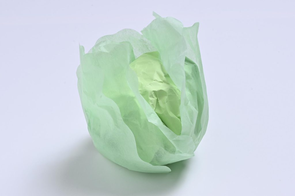 丸くて、ふわっとした葉っぱが特徴のレタス。柔らかい葉はお花紙のような薄い紙を使うと雰囲気が出ます。