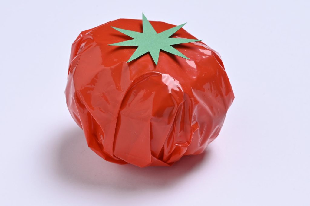 真っ赤でツヤツヤしたトマトっておいしそう! みずみずしさはポリ袋で表現しました。