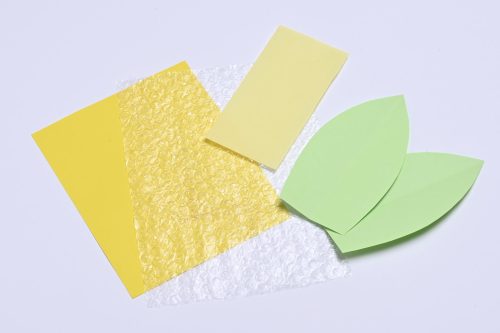 材料 色画用紙、カラーコピー用紙(または色画用紙や折り紙)、プチプチシート(梱包用シート)