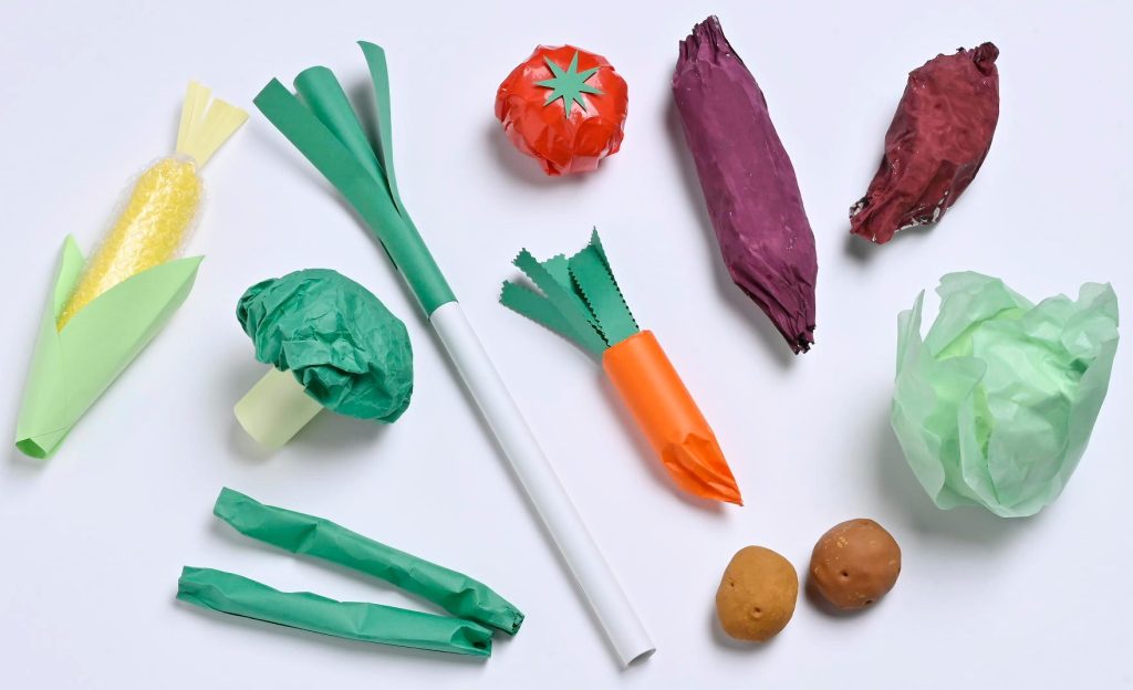 子どもたちにも親しみのあるいろいろ野菜の作り方アイデアを集めました。身近な素材で作れるものばかり。「どんな特徴があるかな?」と、子どもたちとおしゃべりしながら作ってみましょう。