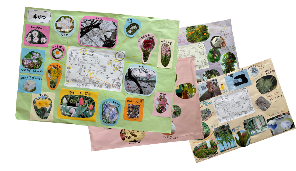 そこで、見つけたものを写真に撮ったり、絵に描いたりして、 園庭の地図のまわりに貼っていきます。