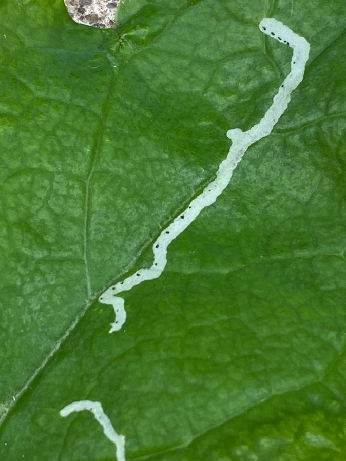 葉っぱの表の皮の下に潜り込んだ虫が、薄〜い層の中にトンネルを掘りながら、葉っぱを食べて、進んでいきます。
