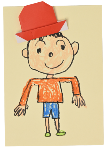 ぼうしをかぶせたい人や動物の絵を描いて、折ったぼうしを貼りましょう。